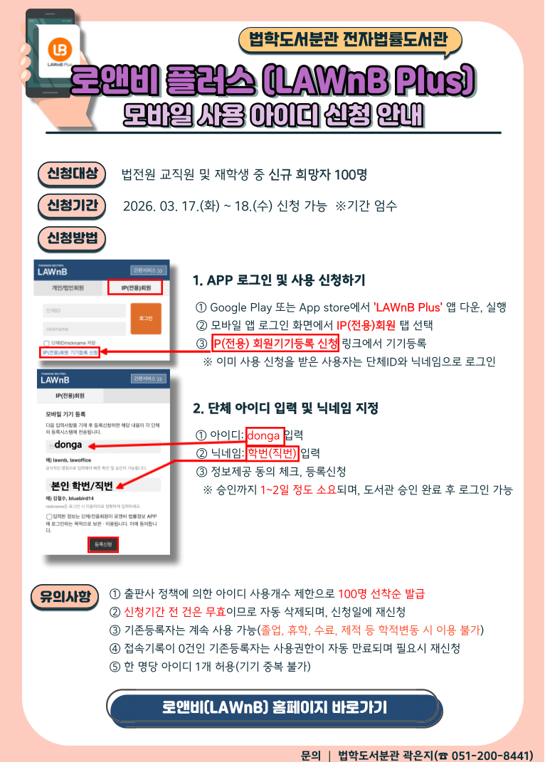 [법학도서분관] 로앤비 플러스(LAWnB Plus) 모바일 사용 아이디 신청 안내