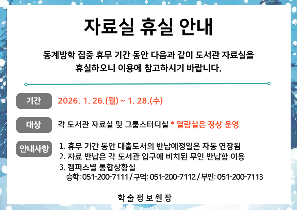 집중 휴무 기간(2026. 1. 26.~1. 28.) 도서관 휴실 안내